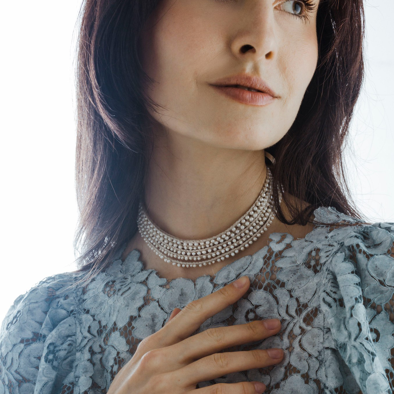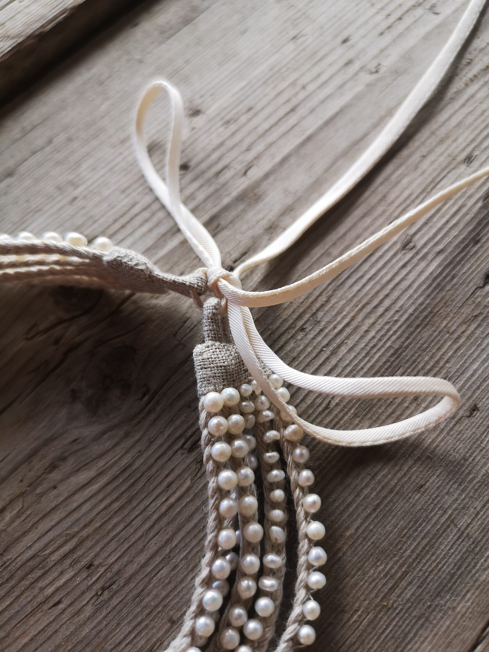 Ожерелок - это наша отсылка к традиционному шейному украшению, бытовавшим на территории бывшей Олонецкой губернии. Он сделан из хлопкового шнура, перламутровых бусин и шёлковых лент, прямо как в старые времена.