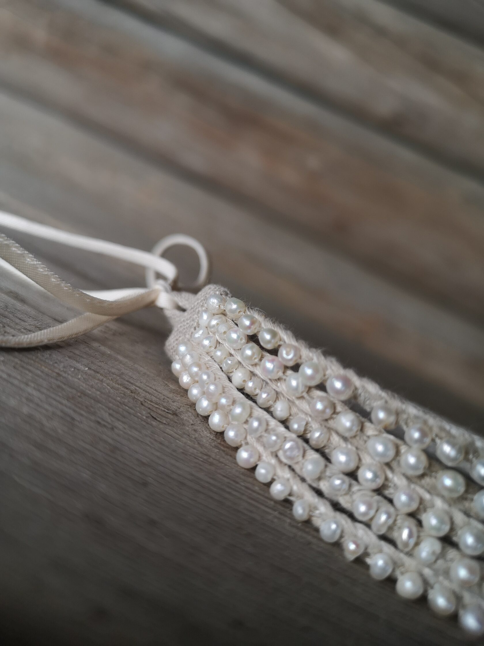 Длина браслета 19 см, на обхват запястья до 18 см. Материалы: хлопковый шнур, жемчуг, шелковая лента, хлопковая подкладка.