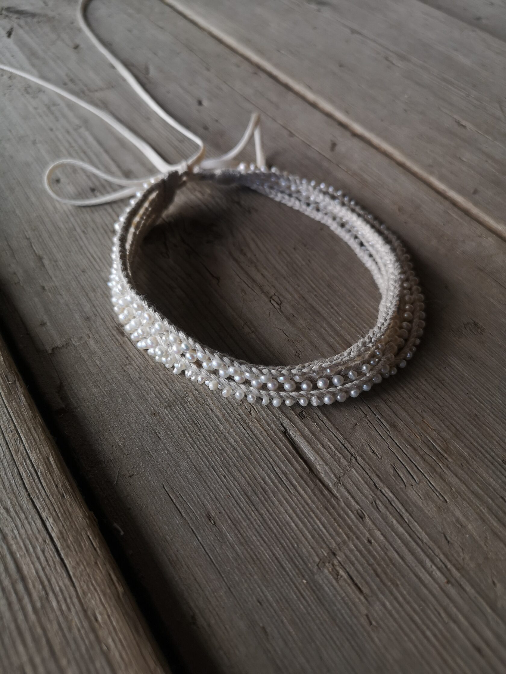 Ожерелок на пять рядов, длина 30 см, плюс ленты, подойдет на любой размер. Украшение по мотивам старинного онежского ожерелка. Материалы: хлопковый шнур, перламутровые бусины, шёлковая лента.